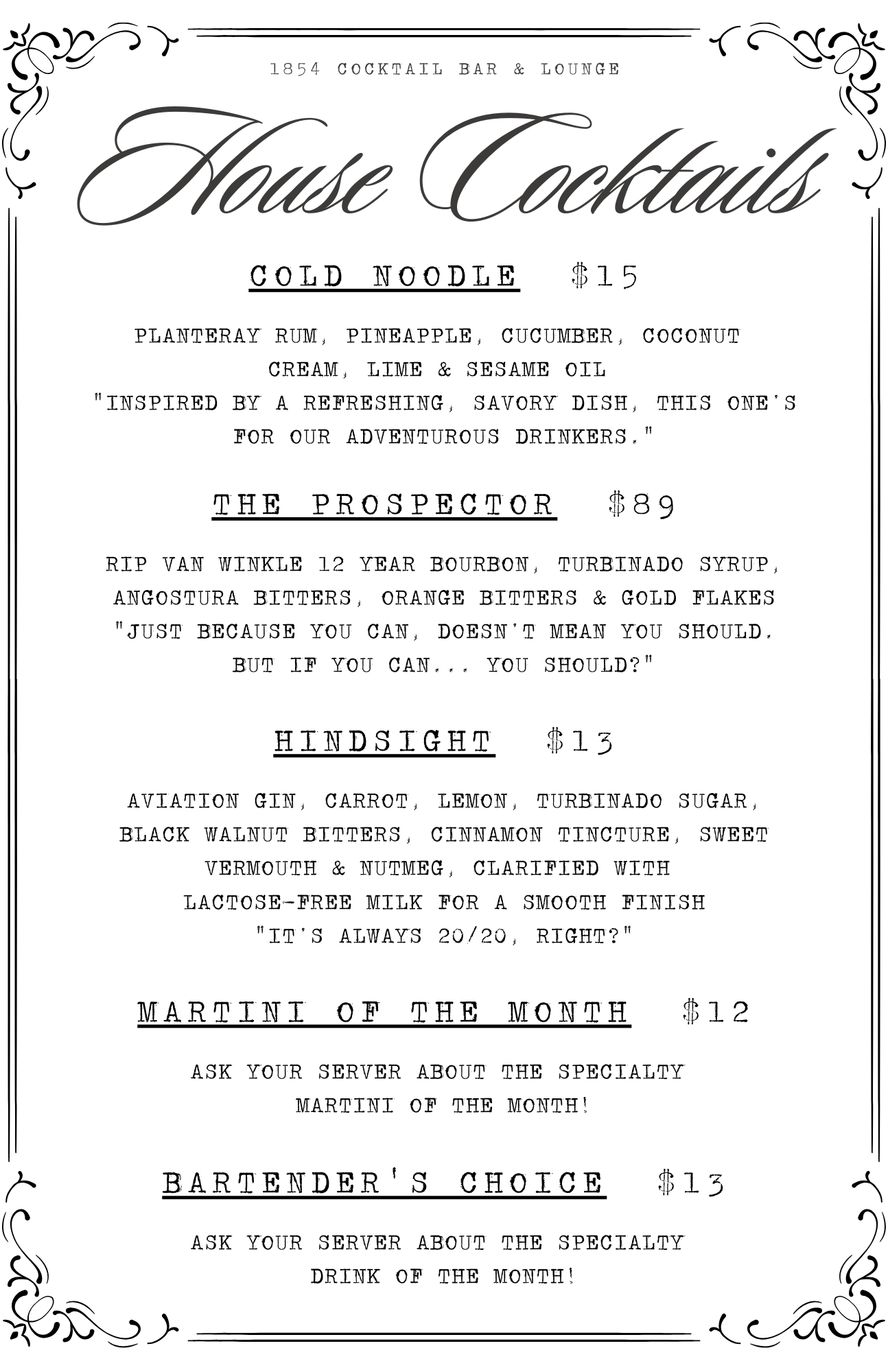Aviation Gin, Carrot, Lemon, Turbinado Sugar, Black Walnut Bitters, Cinnamon Tincture, Sweet Vermouth & Nutmeg, clarified with lactose-free milk for a smooth finishMARTINI OF THE MONTH $12